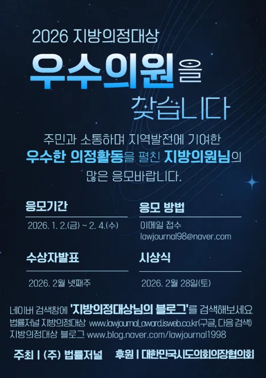 (주) 법률저널이 주최하고 대한민국시도의회의장협의회가 후원하는 '2026 지방의정대상-우수의원' 선정 행사를 실시합니다. 법률저널 지방의정대상은 우수의원, 우수조례, 우수연구단체 발굴을 통해 지방정치인 및 지방의회의 전문성과 역량강화에 앞장서고 있습니다. 지방정치발전에 최선을 다하고 계신 지방의원님들의 많은 응모바랍니다.